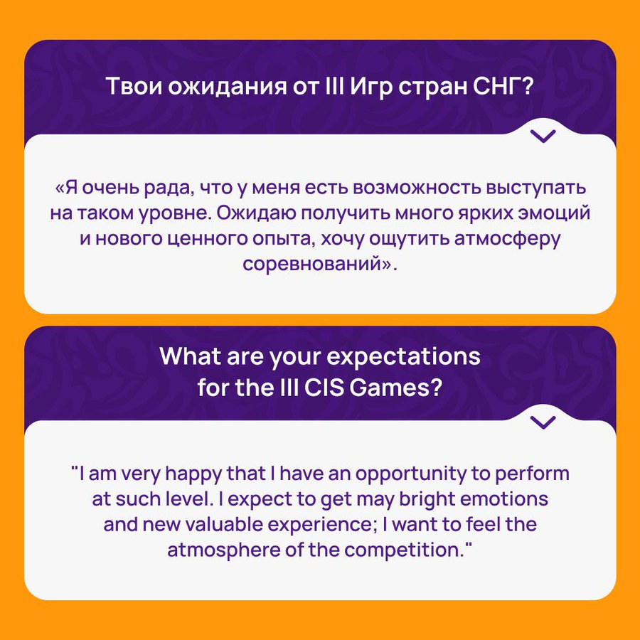 В преддверии III Игр стран СНГ поговорили с Каусар Мейрамбеккызы, гимнасткой из Казахстана. Она выступит на соревнованиях в составе команды Международной Ассоциации «Небесная грация».