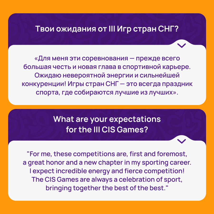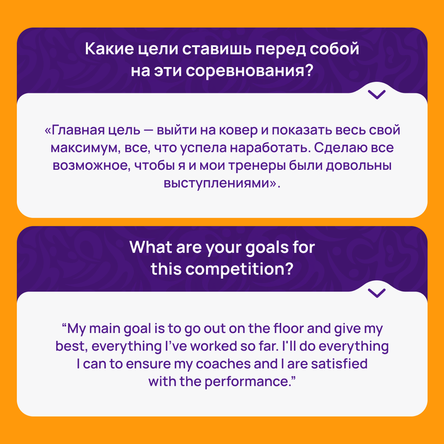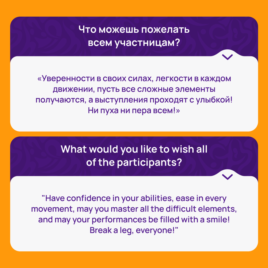 Гимнастка поделилась ожиданиями от предстоящих соревнований, на которых выступит в составе команды Международной Ассоциации «Небесная грация», а также пожелала всем участницам уверенности в силах и легкости в каждом движении: