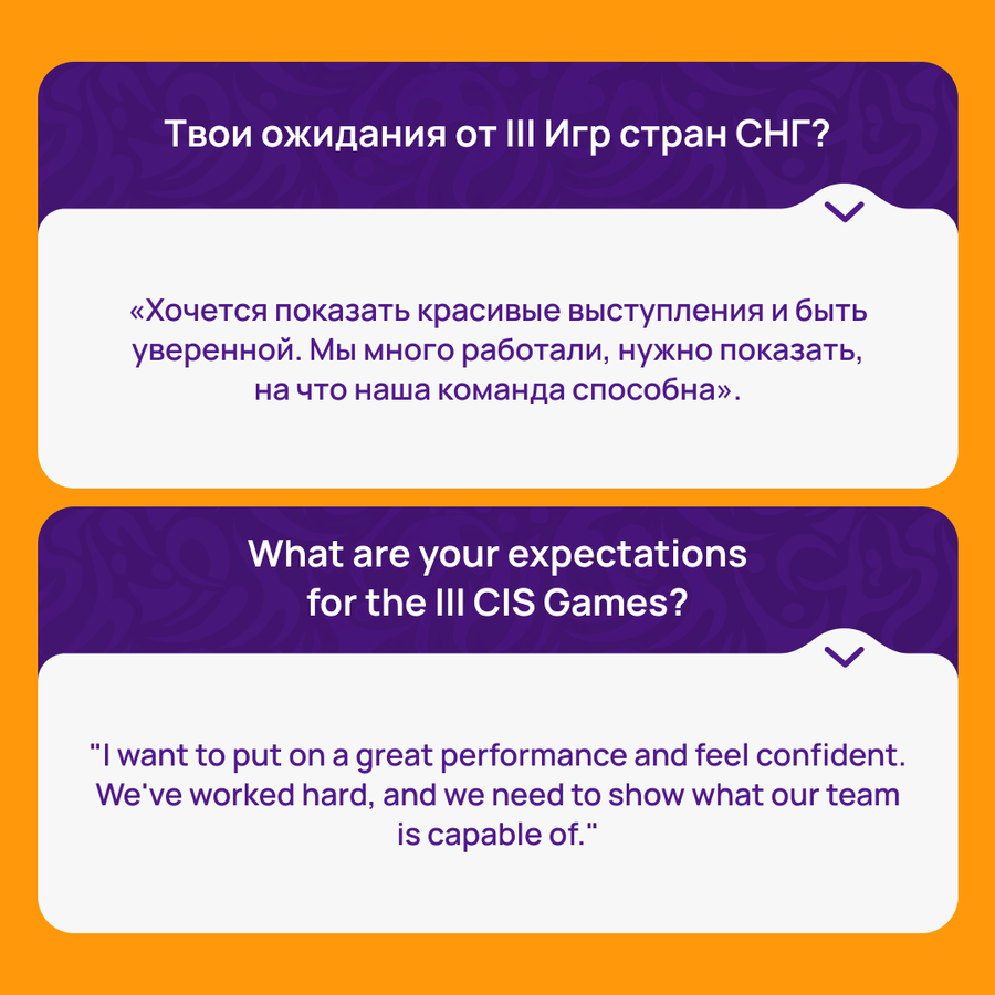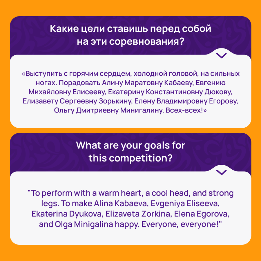 Чтобы узнать о том, с каким настроем и целями гимнастка команды Международной Ассоциации «Небесная грация» подошла к соревнованиям, читайте наши карточки.