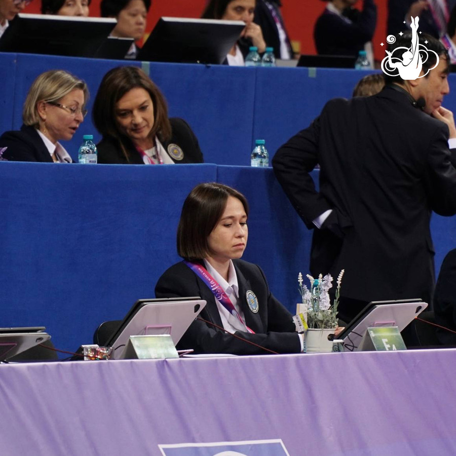 В первый день турнира Ольга Минигалина оценивала исполнение в групповых упражнениях с пятью мячами. Два дня соревнований Ольга Фролова была в бригаде исполнения в личных программах с лентой.