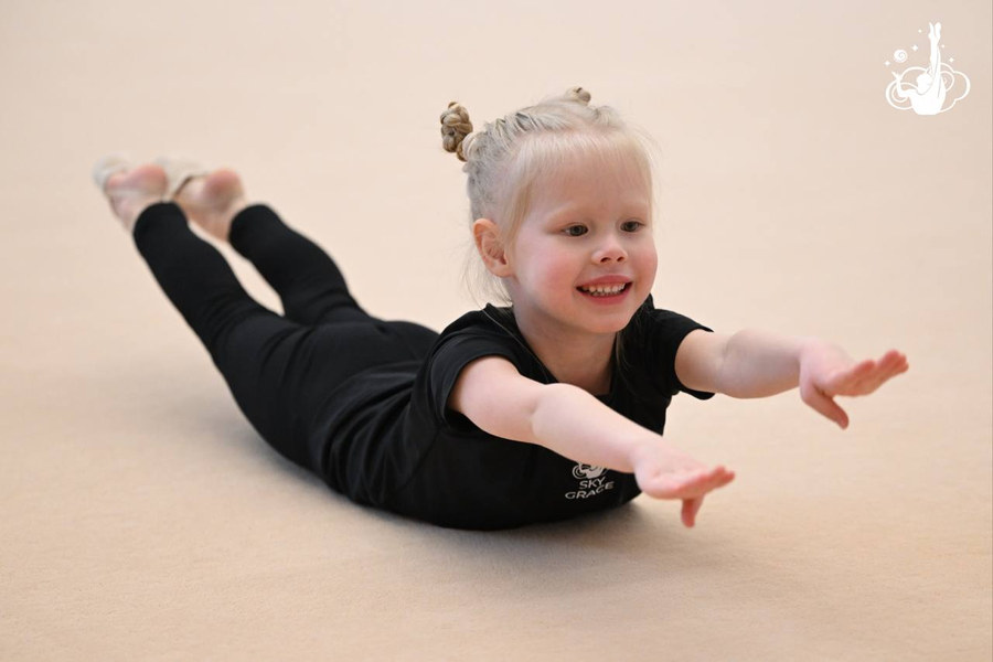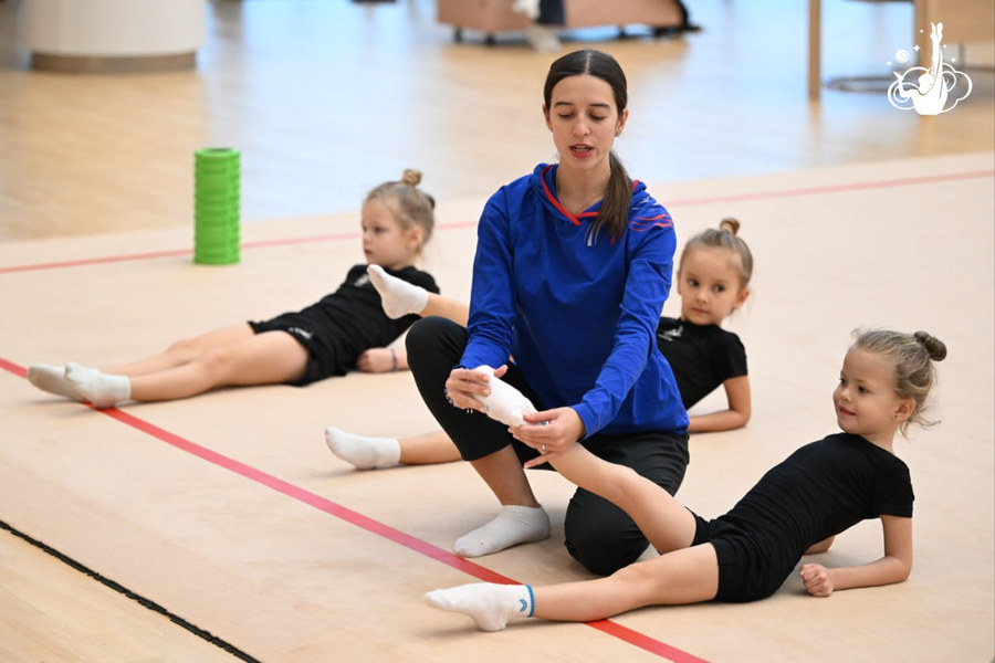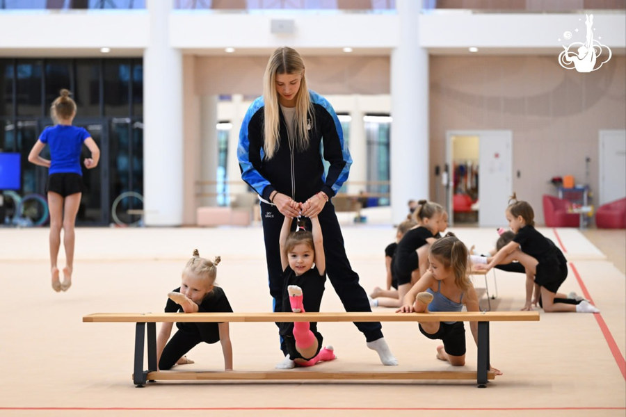 Девочки делали упражнения «рыбка» и «колечко», а также занимались общей физической подготовкой и работали на скамейке под руководством тренеров Екатерины Лоц, Елизаветы Черновой и Елизаветы Зорькиной.